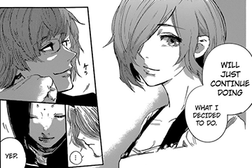 I can’t imagine how Yomo feels when he looks at Touka, who’s silently waiting for Kaneki’s return ever since the Anteiku raid. When Uta comes to the shop, discussing about Sasaki Haise, Touka says, I will keep on doing… what I decided to do.